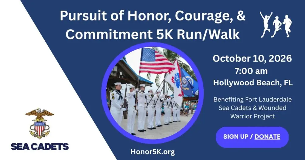 Please join us for the 14th Annual Pursuit of Honor, Courage, and Commitment 5K fundraiser, benefiting the Fort Lauderdale Sea Cadets and Wounded Warrior Project. Walk, Run, or just come out to enjoy beautiful Hollywood Beach at sunrise!
